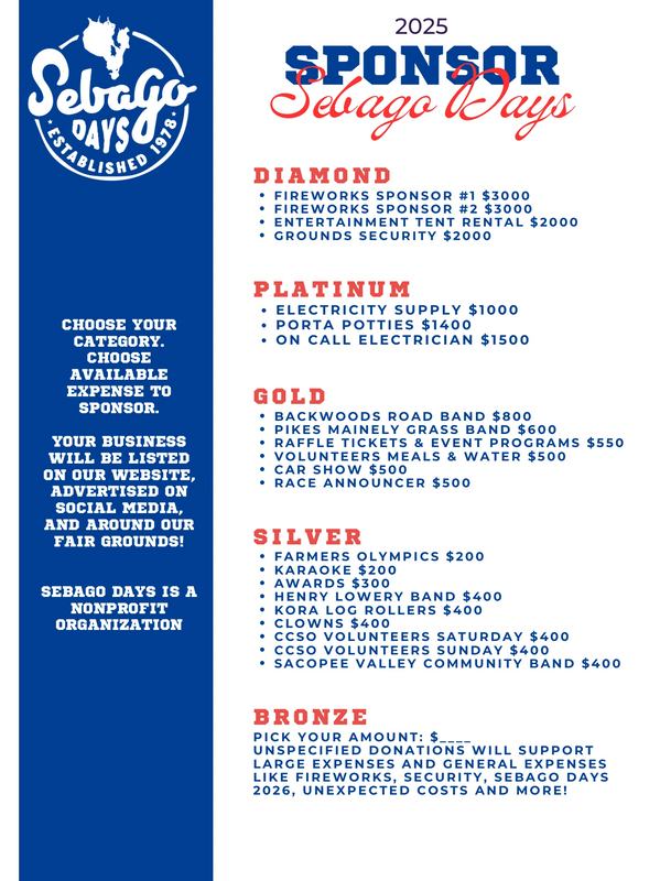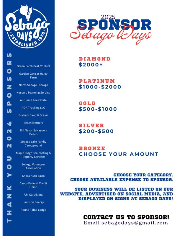 We are thrilled to introduce and extend our heartfelt gratitude to our generous sponsors who make Sebago Days possible. Their unwavering support and commitment helps us bring this vision to life, ensuring a memorable experience for all attendees. Each sponsor plays a pivotal role in the success of our event.